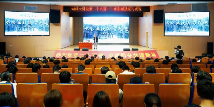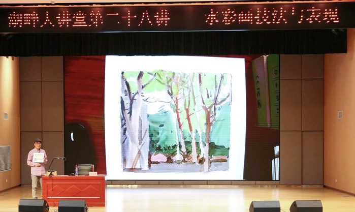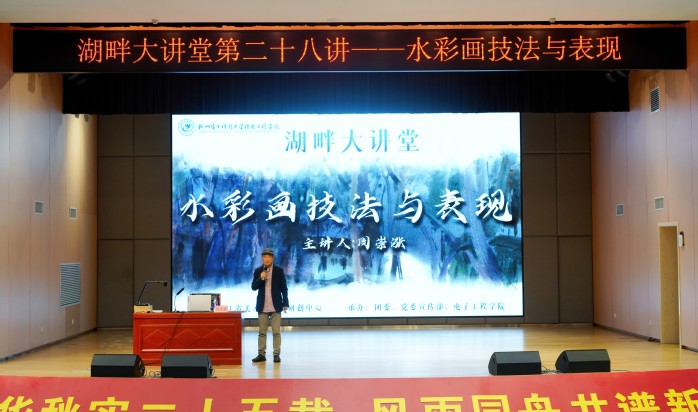 11月1日,湖畔大讲堂第二十八讲《水彩画技法与表现》在我院图书馆报告厅举行。本期湖畔大讲堂由中国美术学院绘画学院教授、中国美术家协会会员、浙江省水彩画家协会主席周崇涨担任主讲嘉宾,学院副院长卢文军,文理学院党总支书记张朝霞,电子工程学院党总支副书记李亭及300余名师生聆听讲座。
