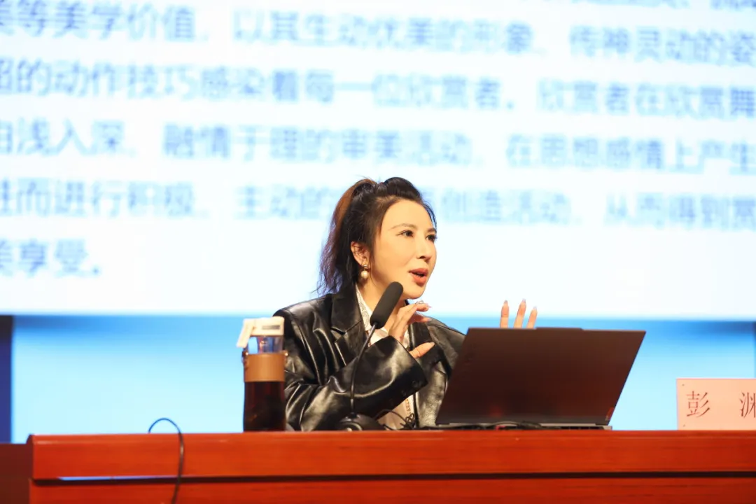 本次讲座有幸邀请到了中国高等教育音乐协会会员、杭州市钱塘区舞蹈家协会秘书长、杭州电子科技大学艺术教育中心主任彭渊担任主讲嘉宾。彭渊老师以其深厚的舞蹈艺术造诣和丰富的舞蹈教学与创作经验,为在场的师生带来了一场关于美的教育的精彩演讲。