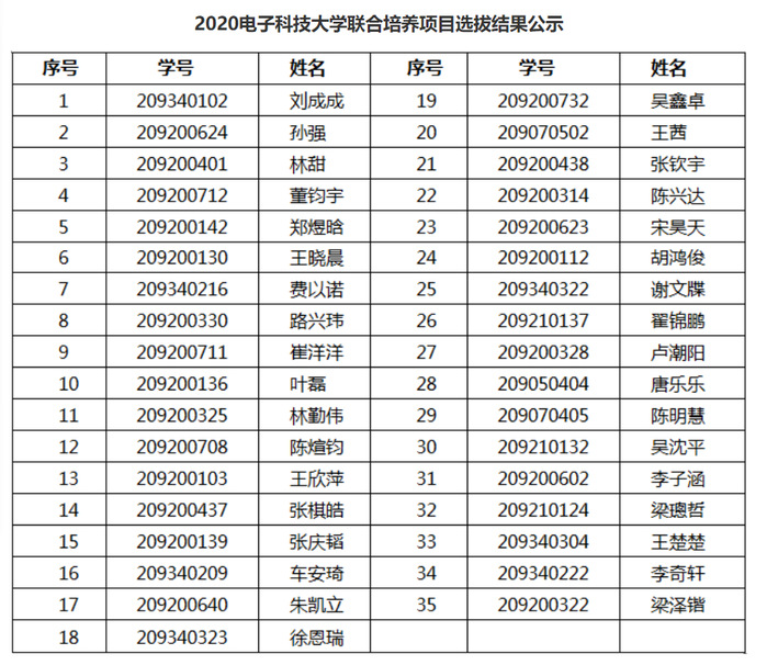 经学生自主报名,2020级电子科技大学联合培养项目共收到49份报名申请。经初审和面试两轮选拔,拟预录取35位同学进入2020级电子信息工程(成电联合培养)班学习,预录取后不得有任何处分记录,否则将取消资格。现将预录取结果予以公示,具体名单见附件。