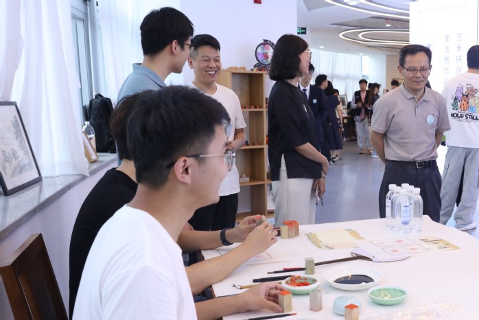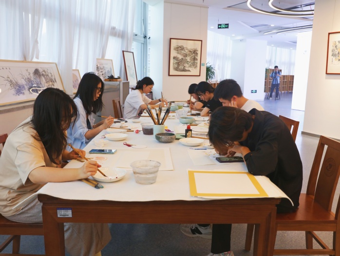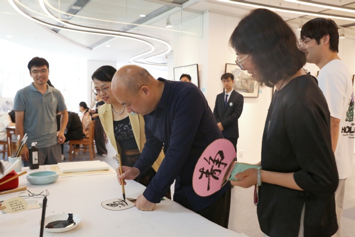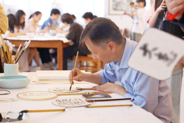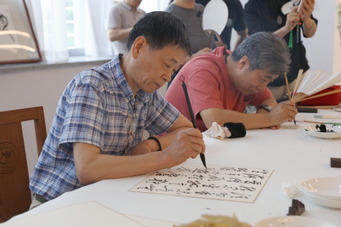 活动区,书画名家、师生执笔在团扇上挥毫如行云流水,廉洁文化于创作间浸润了心灵。