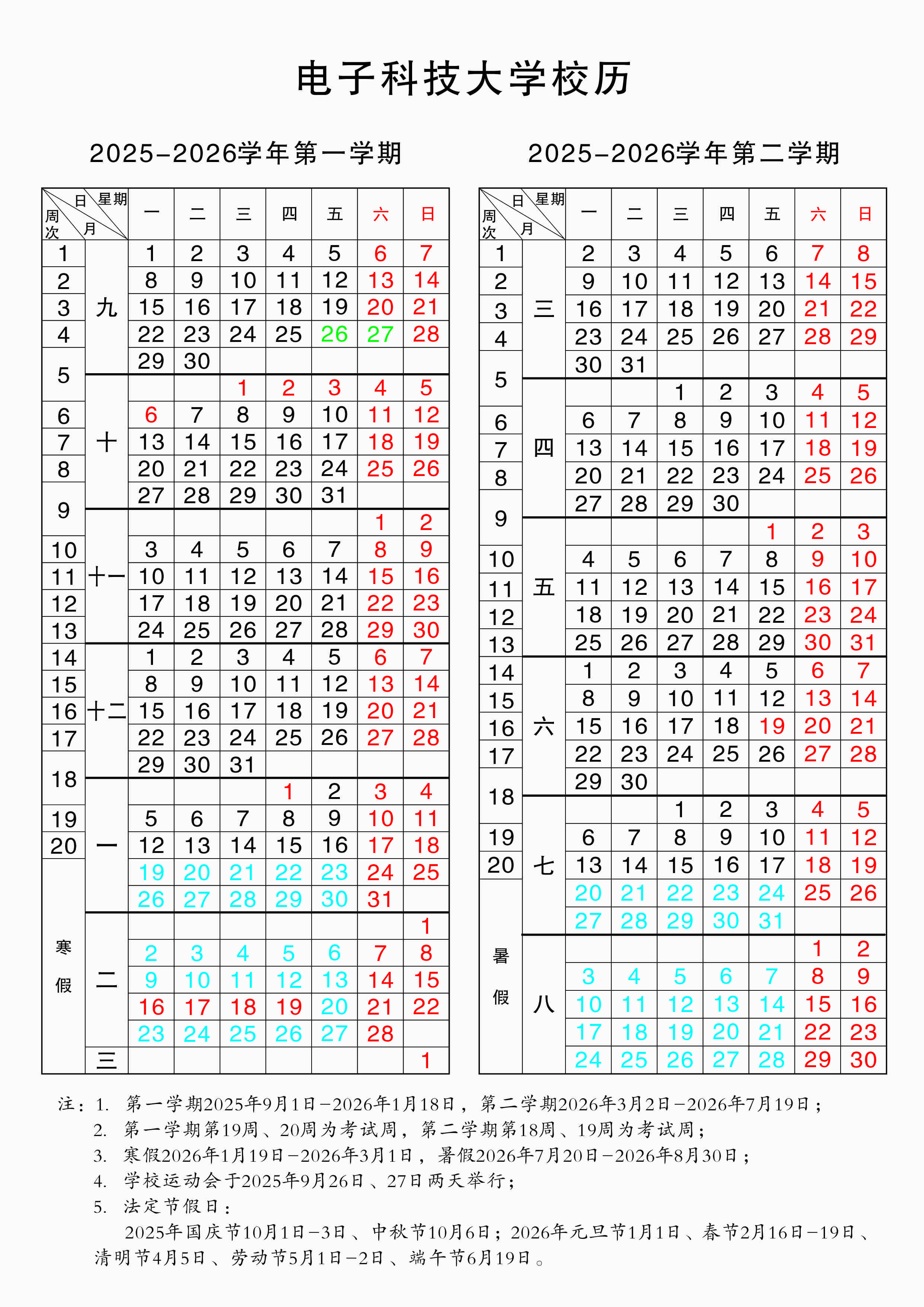 电子科技大学 2025-2026学年校历