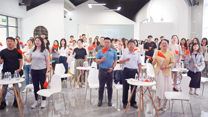 课程尾声,通过视频与歌曲《人民军队忠于党》的融合,回顾了从通道转兵到遵义会议、直至长征胜利的历程。活动在全体师生挥舞国旗、高唱《没有共产党就没有新中国》中达到高潮。