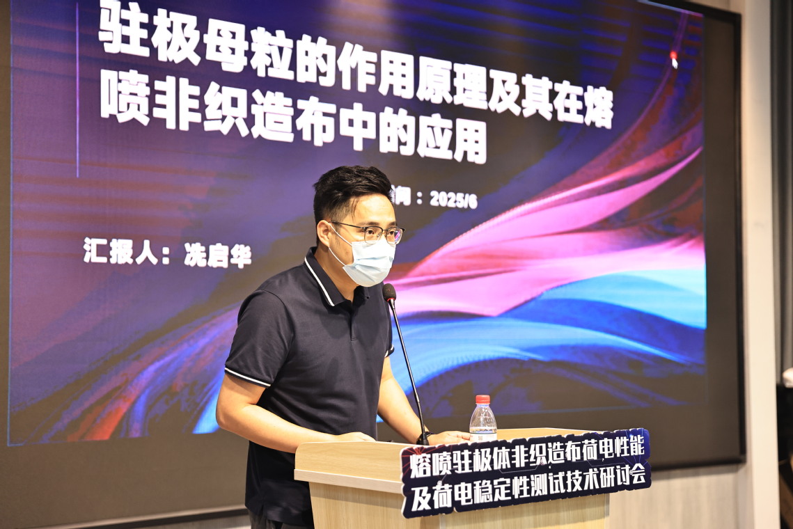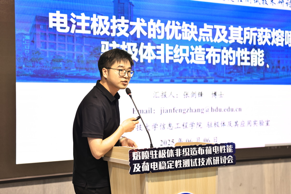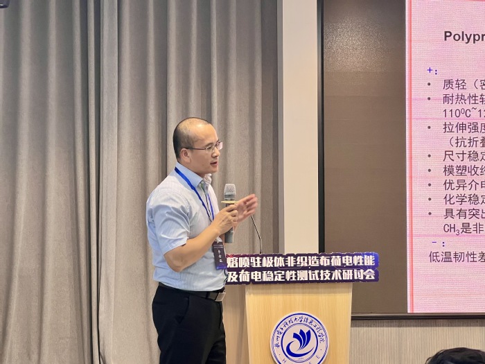 研讨会上,多位专家学者带来了精彩的学术报告。广东东沁新材料科技有限公司总经理冼启华结合企业实践,深入剖析了注极母粒在熔喷驻极体非织造布制备中的关键作用与应用前景;杭州电子科技大学驻极体及其应用实验室张剑锋博士分享了电注极技术的最新研究成果,探讨了不同工艺参数对材料性能的影响;东华大学王洪教授(由其学生闵雨晴代为报告)围绕水注极技术展开论述,介绍了其团队在提高材料荷电稳定性方面的创新思路与实践经验。