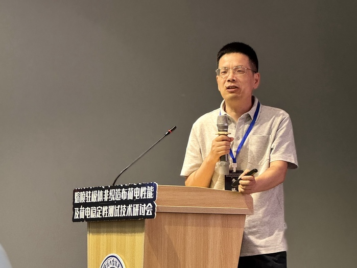 在行业标准研讨环节,全国产业用纺织品标准化技术委员会秘书长、教授级高级工程师刘飞飞对熔喷驻极体非织造布相关行业标准进行了详细介绍,陈钢进教授结合标准编制过程中的关键问题,与参会代表展开了深入讨论。华东理工大学教授、博士生导师、上海东方学者特聘教授邱勋林则围绕驻极体及其相关现象进行了主旨演讲,分享了其团队在该领域的研究成果,为理解熔喷驻极体非织造布的荷电性能提供了科学依据。杭州泽胜仪器有限公司总经理骆冠松展示了热刺激放电仪的研发历程以及在荷电稳定性测试中的应用,为标准的实施提供了有力的技术支持。