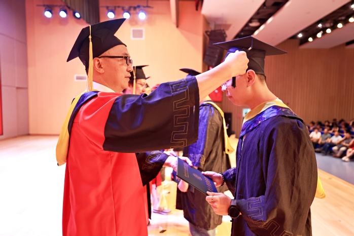 仪式期间,徐毅鹏宣读学位授予文件,毕业生们分批登台,领取学位证书,并接受主礼教授为其拨穗正冠。