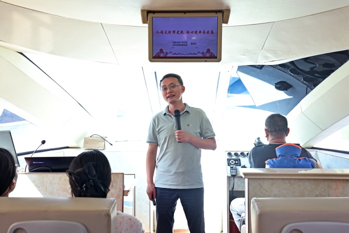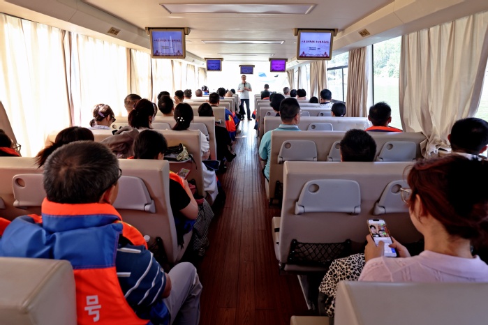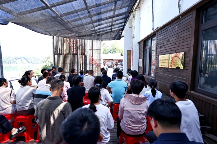 响洪甸水库作为治淮骨干工程,以其磅礴气势与精巧设计著称。读书班学员乘船前往核心小岛。途中,微课《人间天河淠史杭初心使命永不忘》娓娓道来,淠史杭灌区“劈山引水、降伏旱魔”的壮举,这堂生动的水利史诗课,在学员们心中刻下“为民担当”的深刻印记。登上梅山水库大坝和麻埠镇海岛,学员们亲身感受工程的宏伟与建设的精妙,在水光山色间触摸其中蕴含的智慧与力量。