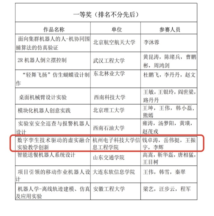 在决赛答辩现场,钱卓涛团队凭借扎实的理论功底、创新的实验设计及对机器人技术应用的深度探索,圆满完成《数字孪生技术驱动的虚实融合实验教学创新》汇报,出色地回答专家评委提问,从985、双一流高校教师云集的赛场奋勇角逐,最终获得大赛最高奖项一等奖,实现了历史性突破。