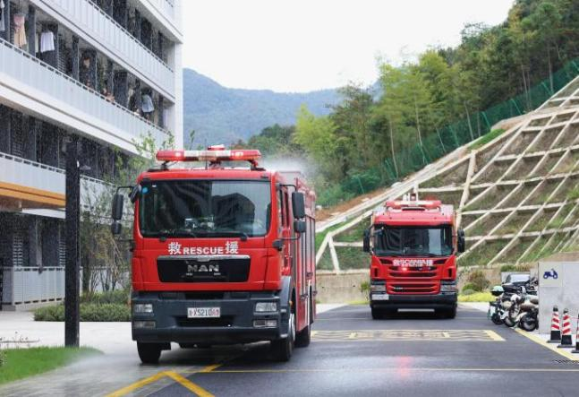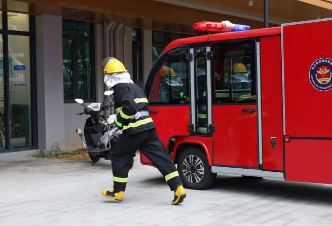 此次演练模拟宿舍7号楼525寝室因充电宝爆炸起火,随着火情“发生”,演练严格按照预定步骤展开:第一步,发现火情,迅速报警。一名路过的学生发现险情后,立即拨打校园119报警电话,清晰报告了位置和初步情况。第二步,快速响应,初期处置。校园119接警后,消防应急小分队迅速出动,身着消防服,驾驶巡逻车拉响警笛赶赴现场,立即连接消火栓、铺设消防水带进行初期火灾扑救。同时,疏散组、警戒组、秩序组同步高效启动,引导楼内学生疏散、设立警戒区域、维持现场秩序。第三步,火势升级,寻求外援。由于“火势”迅速蔓延,校园110指挥中心立即向消防队报火警,并请求专业力量支援。第四步,有序疏散,科学逃生。响亮的警报声和广播提示声响起,楼内学生在工作人员引导下,用湿毛巾捂住口鼻,低姿弯腰,快速而有序地撤离至指定集合点。第五步,专业救援,展示技能。青山湖消防中队消防车呼啸而至,消防员们迅速投入“战斗”,指挥员现场勘察、果断决策,战斗员们紧密配合,高效作业。在所有参演力量的协同配合下,楼内学生全部安全疏散,“大火”被成功扑灭,演练环节圆满结束。