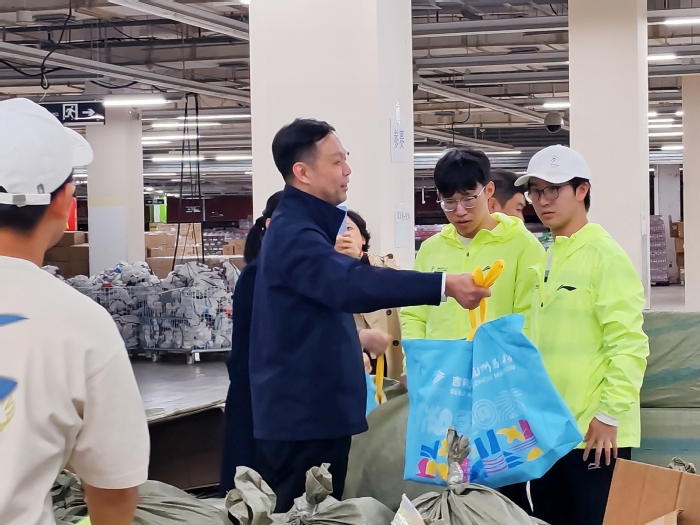 朱启南不仅带来了关怀,更亲身参与到志愿服务中。他与志愿者们一同归纳整理完赛包,并交流装包技巧与心得,对同学们高效有序的协作和认真负责的态度给予了高度肯定。